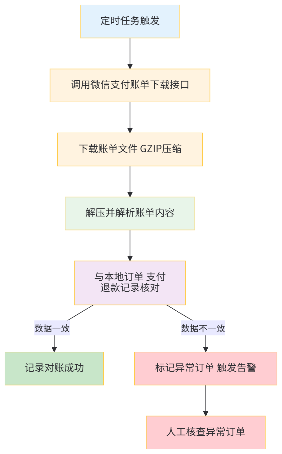 * 每日凌晨1点下载前一日账单并对账(微信支付账单生成时间为次日0点后)
