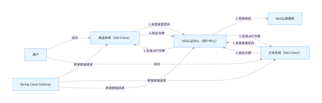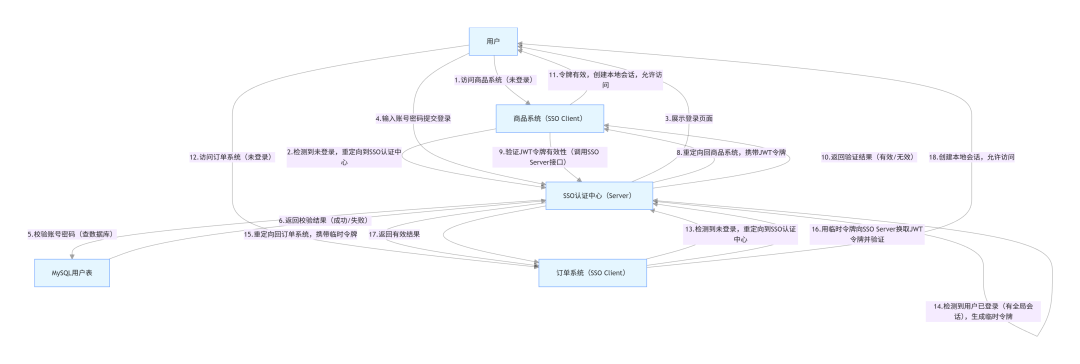 SSO的核心逻辑是“统一认证、凭证共享、信任传递”,不同实现方案(如Cookie+Session、JWT、OAuth2.0)的流程本质一致,只是凭证类型和传递方式不同。下面以电商最常用的“JWT令牌模式”为例,用流程图拆解完整流程,并解释关键环节的设计思路。