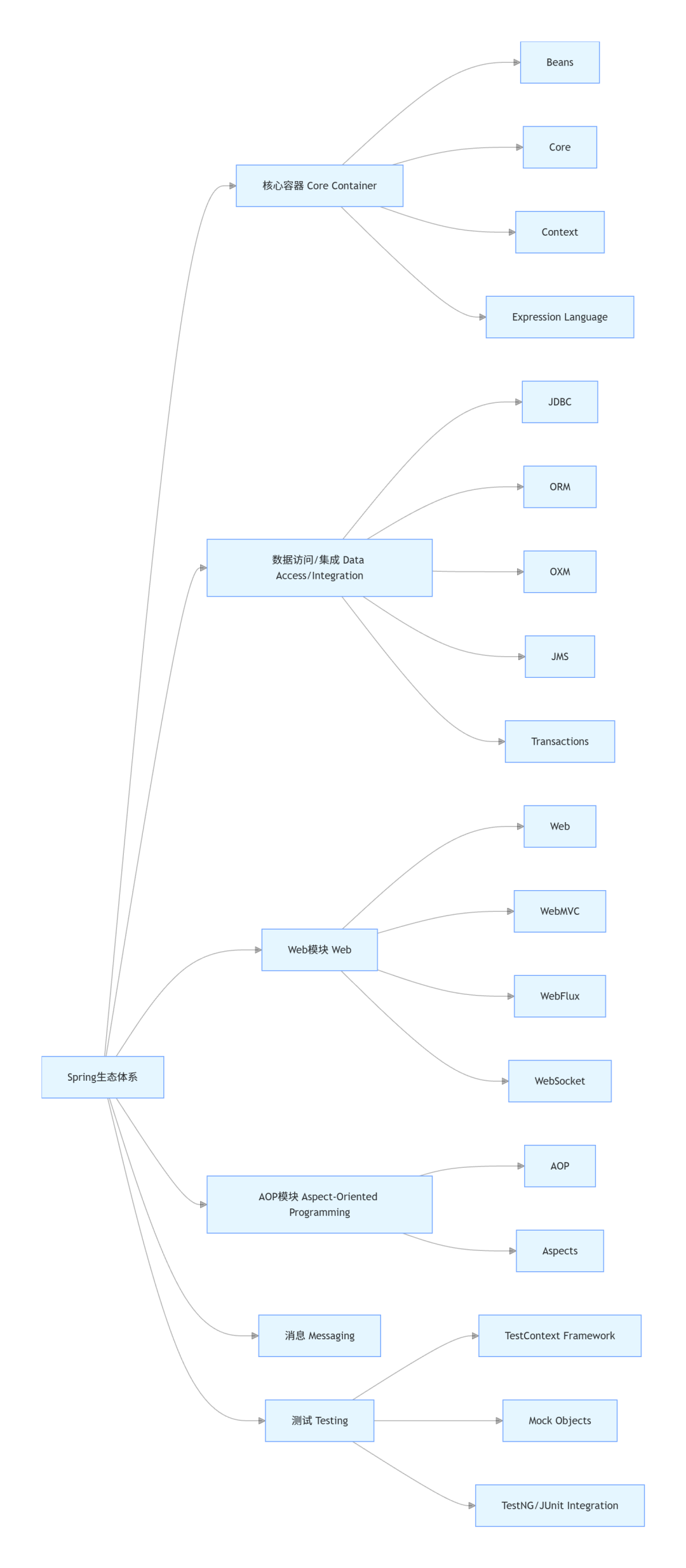 Spring 体系结构的核心是“分层设计+模块化拆分”,围绕“IOC容器”和“AOP”两大核心思想,构建了覆盖核心容器、数据访问、Web开发、测试等全链路的生态体系。