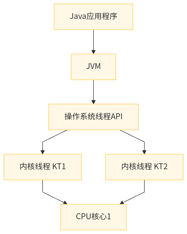 Java线程在JDK 1.2之后,采用“一对一”的线程模型——即一个Java线程对应一个操作系统内核线程(Kernel Thread,KT)。其底层逻辑如下: