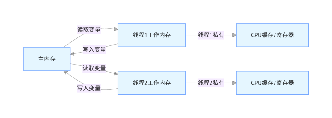 JMM规定了所有变量都存储在主内存中,每个线程有自己的工作内存,线程对变量的所有操作都必须在工作内存中进行,不能直接读写主内存的变量。线程间的变量传递,必须通过主内存完成。