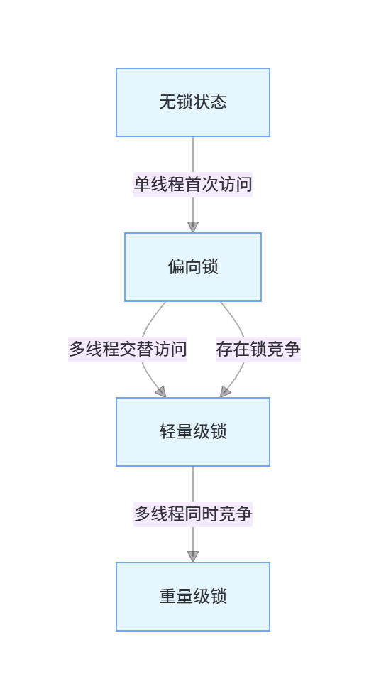 Mark Word根据锁状态分为四种:无锁、偏向锁、轻量级锁、重量级锁。注意:JDK15及以后,偏向锁默认关闭,需手动开启-XX:+UseBiasedLocking参数,因为高并发场景下偏向锁的撤销开销远大于收益。