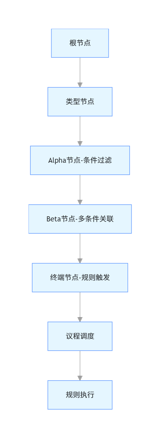 Rete算法会将所有规则拆解成节点,构建一个有向无环图(Rete网络),核心节点与执行流程如下: