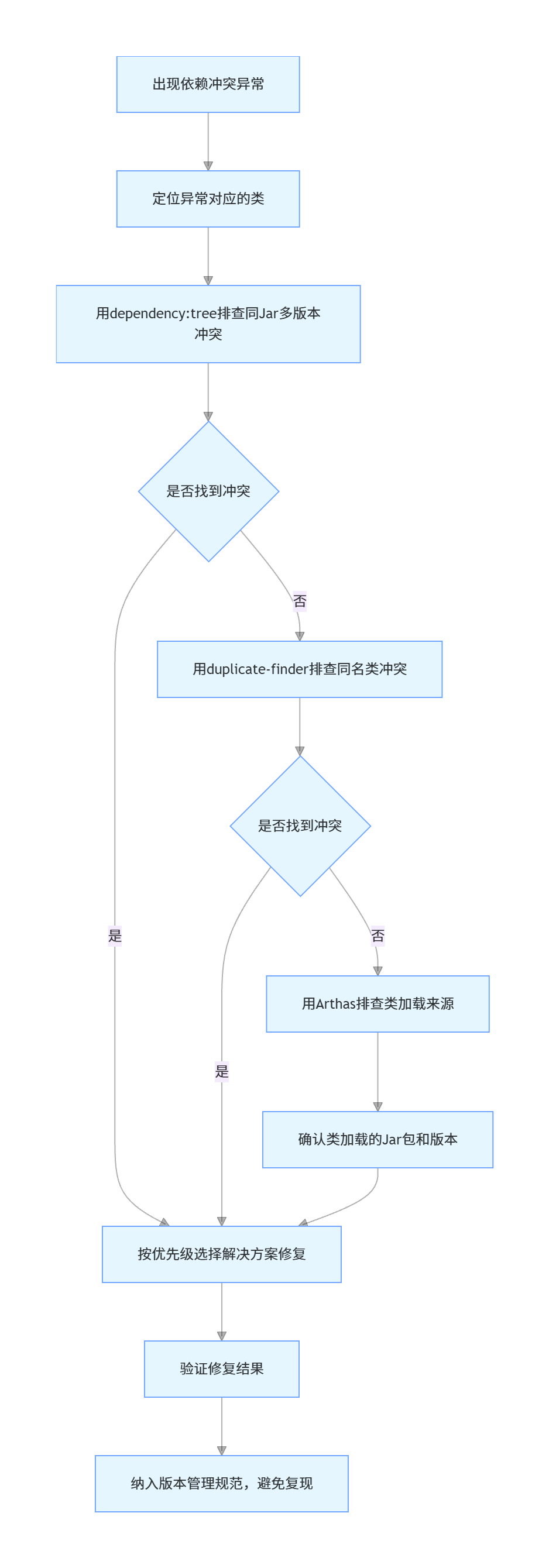 mvn dependency:analyze清理无用依赖。mvn clean package确保项目正常编译,mvn dependency:tree检查无冲突,禁止将冲突代码提交到仓库。Maven依赖冲突的本质是类加载的唯一性与依赖传递的多版本之间的矛盾,解决冲突的核心逻辑是:先搞懂Maven依赖调解的底层规则,再用专业工具精准定位冲突根源,最后按照优先级选择最优的解决方案,而非盲目排除。