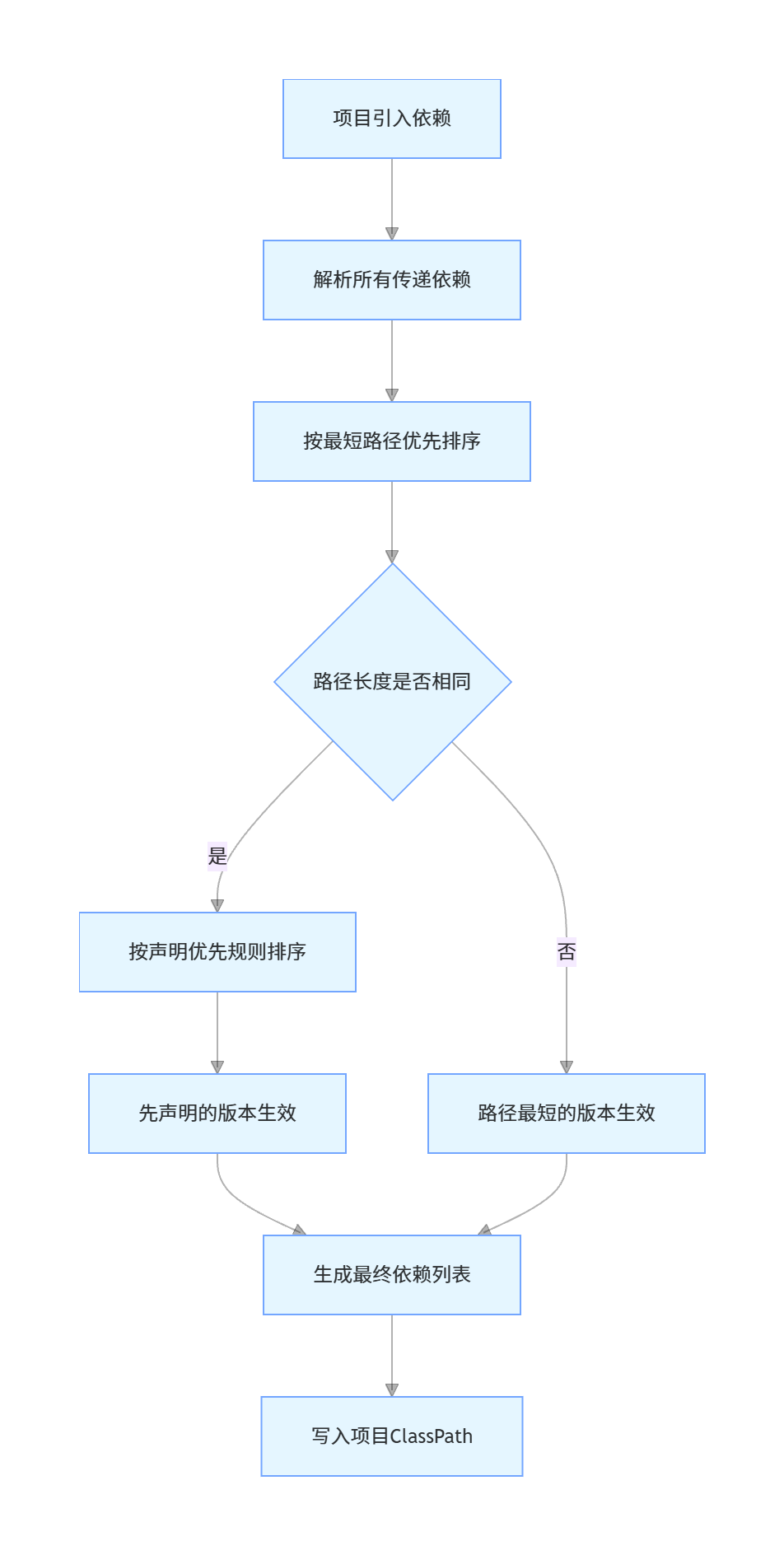依赖树中,距离项目路径最短的Jar版本优先生效。