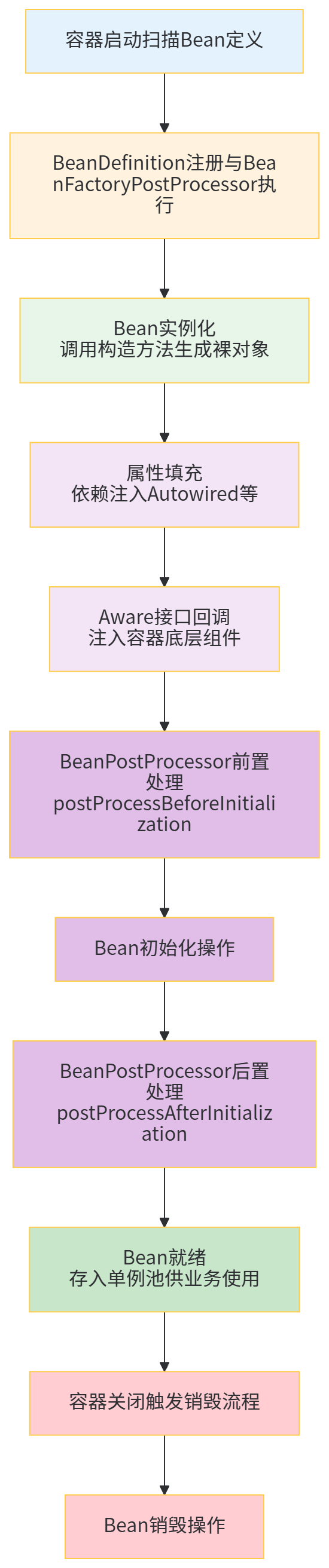 先给出Spring 6.x标准的Bean生命周期全流程流程图,执行顺序100%匹配源码逻辑:
