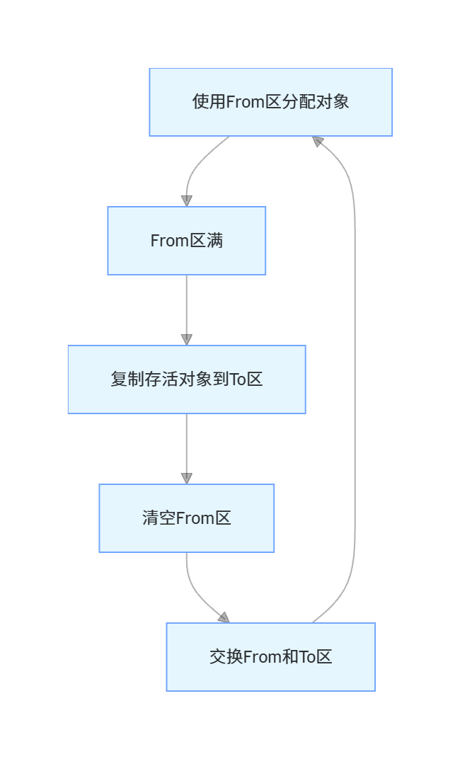 年轻代用于存放新创建的对象,大多数对象朝生夕死,因此采用复制算法。年轻代分为Eden区和两个Survivor区(From和To),默认比例为8:1:1。工作流程: