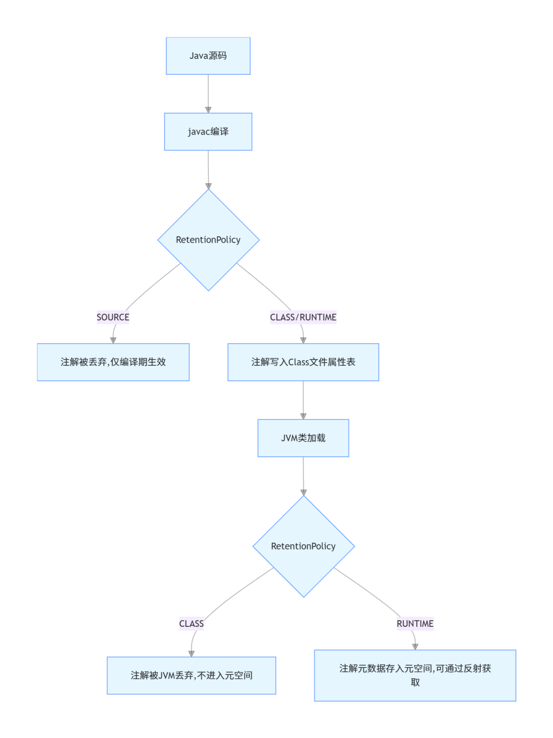 RUNTIME | 运行期全生命周期 | 框架动态配置、反射处理(Spring、MyBatis核心依赖) | 写入Class文件,JVM加载后存入元空间,运行期可通过反射获取 |