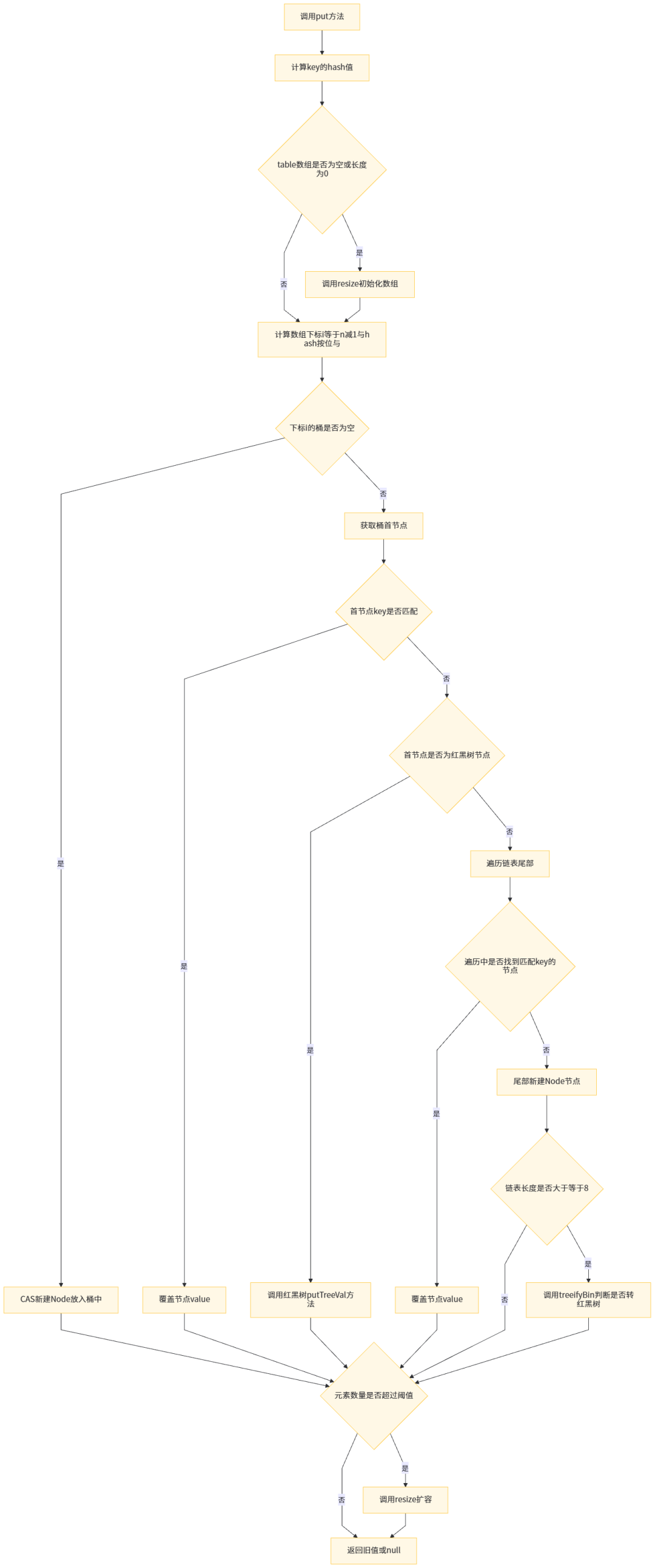 (n - 1) & hash,等价于hash % n,但位运算效率远高于取模,这也是数组长度必须是2的幂的核心原因put方法是HashMap的核心,完整流程如下: