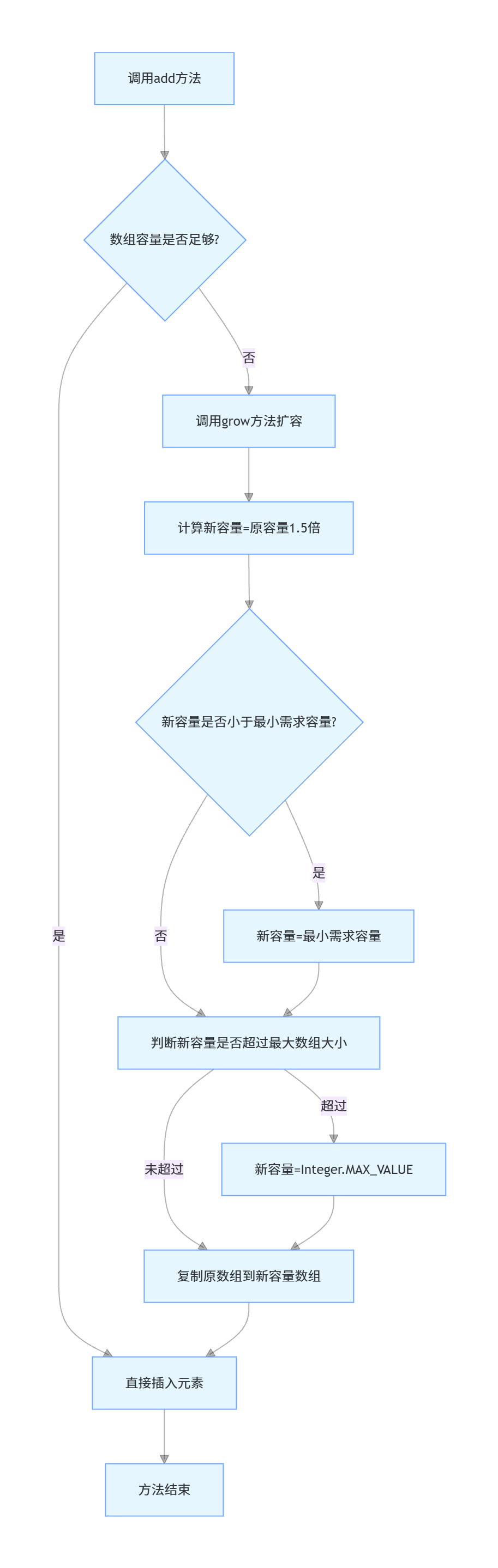 oldCapacity + (oldCapacity >> 1),位运算效率远高于除法)Integer.MAX_VALUE - 8,则直接扩容至Integer.MAX_VALUEArrays.copyOf()复制原数组到新容量数组,完成扩容扩容流程如下: