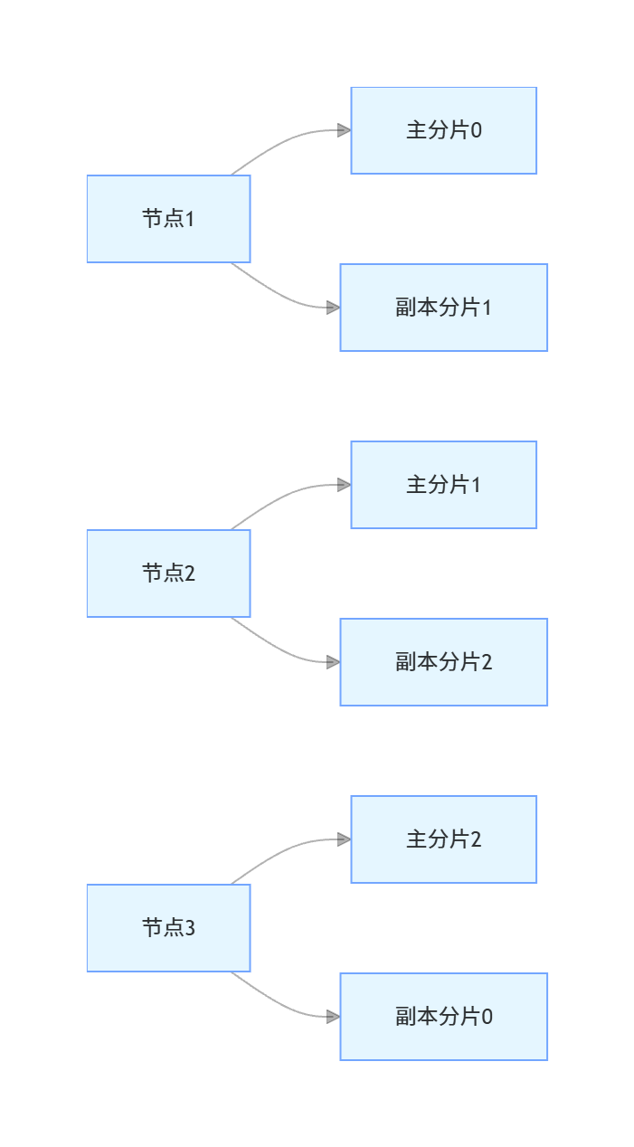 一个标准的3节点集群,3主分片1副本分片的架构如下: