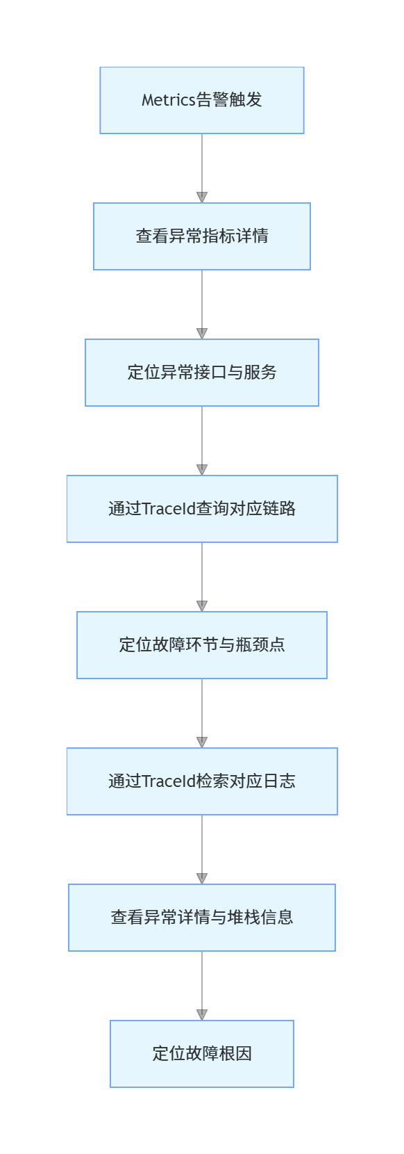 完整的故障排查流程,是三大支柱协同的核心价值,流程如下: