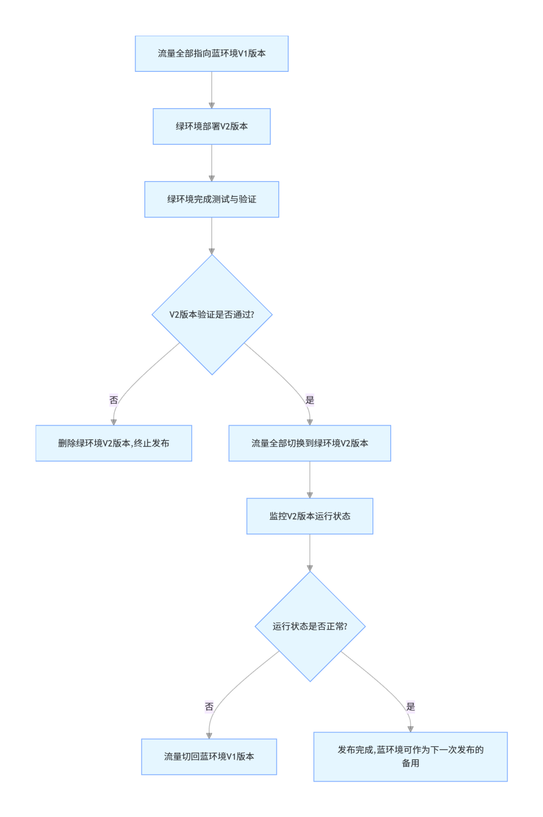 蓝绿部署的原理是:准备两套完全相同的服务环境,蓝环境运行当前的线上稳定版本,绿环境部署新版本,对绿环境完成完整的测试验证后,将流量一次性从蓝环境切换到绿环境,完成发布。