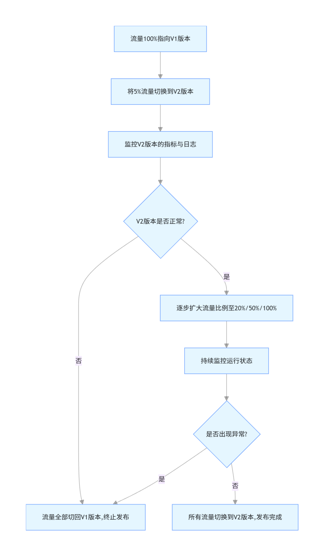 金丝雀发布的原理是:先将一小部分流量切换到新版本,监控新版本的运行状态、错误率、性能指标,确认没有问题后,逐步扩大流量比例,直到所有流量都切换到新版本,期间如果出现问题,立即切回流量,终止发布。