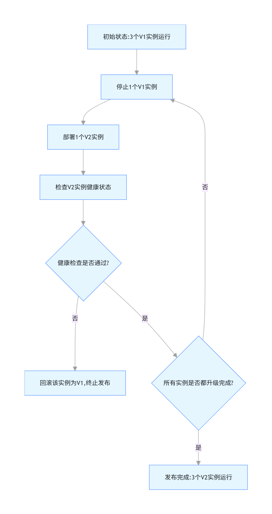 滚动发布的原理是:逐个或分批替换旧版本的服务实例,直到所有实例都升级为新版本,发布过程中服务始终有实例在运行,不会停机。