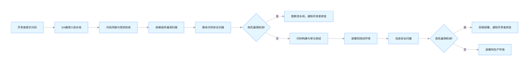 将安全审计集成到CI/CD流程中,实现安全左移,在开发阶段就发现并修复安全漏洞,避免漏洞流入生产环境。 核心集成流程: