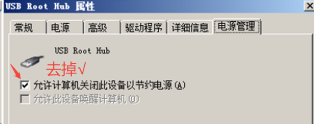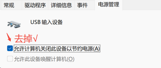 解决方案:打开设备管理器(运行devmgmt.msc)找到如图圈出的设备,右键属性→ 电源管理→ 去掉允许关闭以节约电源前面的√