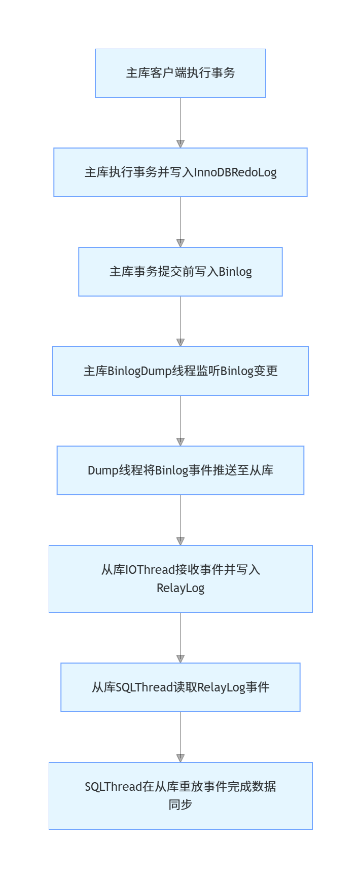 主从复制的完整数据流转链路共8个核心步骤,覆盖从主库事务提交到从库数据同步完成的全流程: