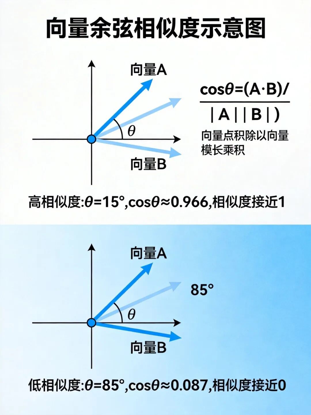 余弦相似度关注向量的方向,不是长度。在自然语言里,概念的相似性更多体现在"方向"上。