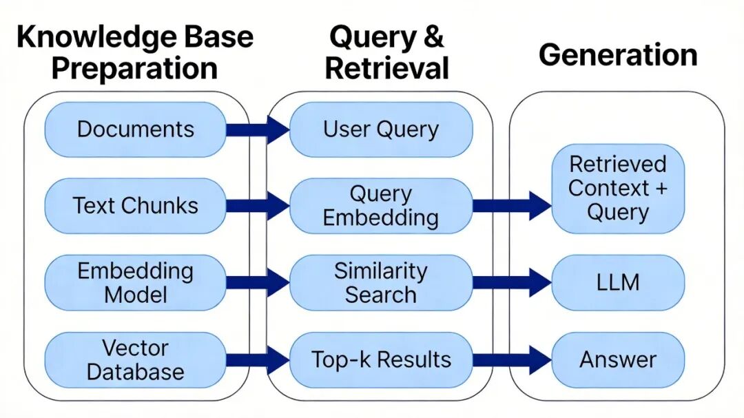 RAG把大语言模型和可搜索的外部知识库结合。核心想法:让模型访问训练时没见过的新信息,提升回答准确性和时效性。