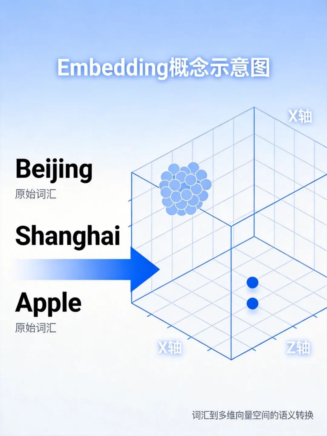 我们说"北京"这个词时,脑子里会想到:城市、首都、政治中心、文化古都。这些概念连在一起,构成我们对"北京"的理解。Embedding做的,就是把这种理解映射到数学空间里。