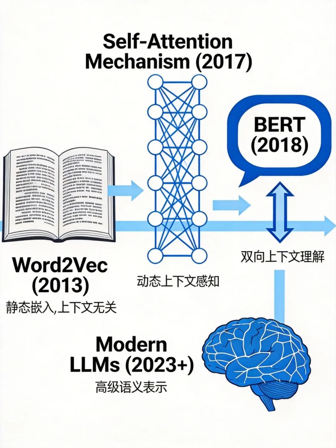 Transformer引入的自注意力机制(Self-Attention)是重大突破。模型生成某个词的向量时,能同时考虑句子中所有其他词。