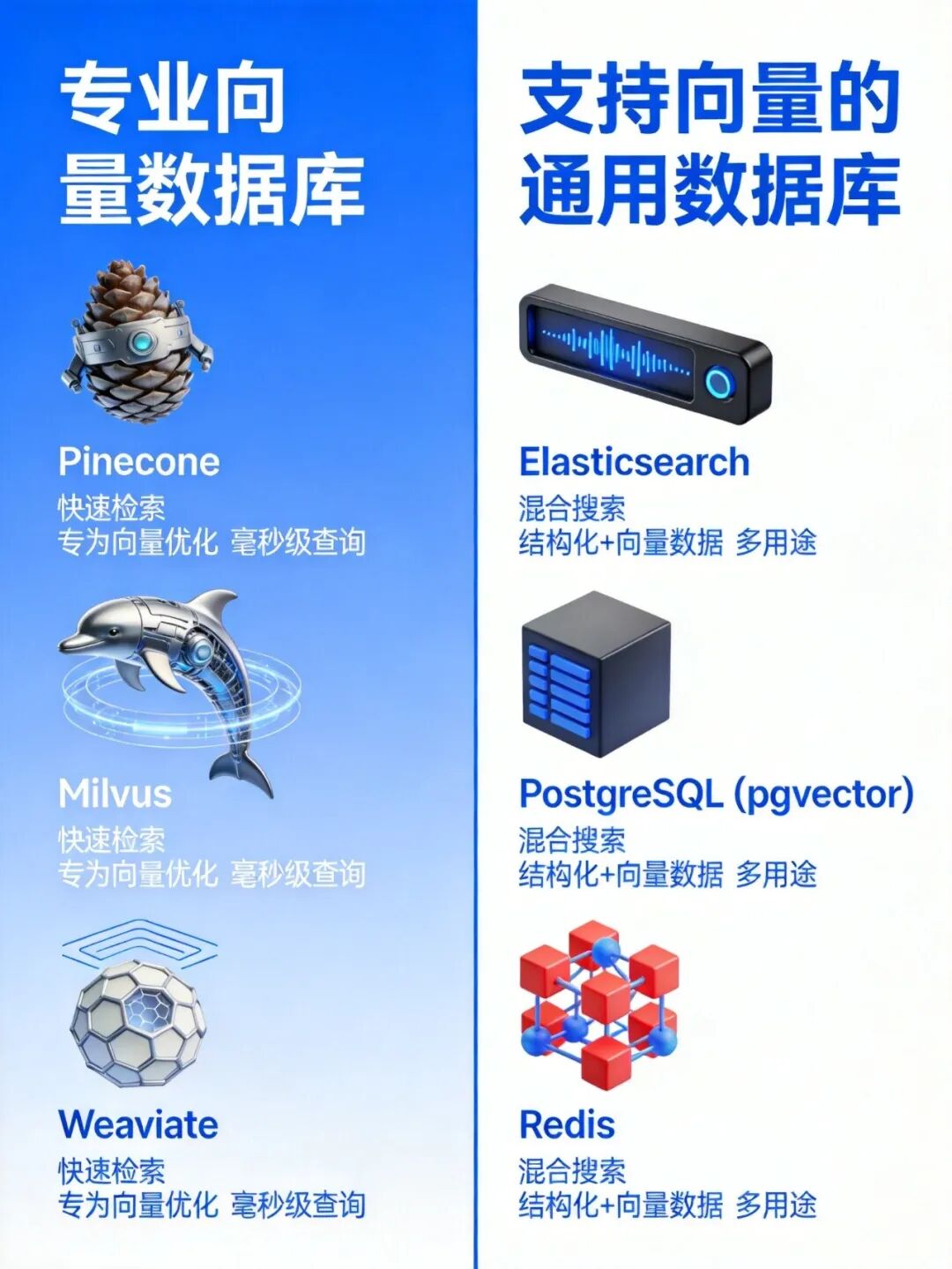 Embedding技术广泛应用后,专门存储和检索高维向量的向量数据库出现了。这类数据库的核心能力是相似性搜索,根据向量距离查找最相似的向量。