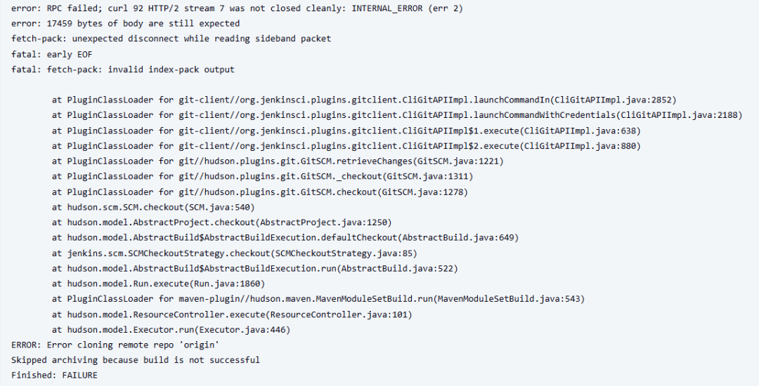 这个错误信息表明在 Jenkins 中使用 Git 插件进行代码拉取时,出现了一个与 RPC(远程过程调用)相关的错误。具体来说,HTTP/2 流在关闭时没有正常关闭,并且在读取 sideband 包时发生了意外断开连接。