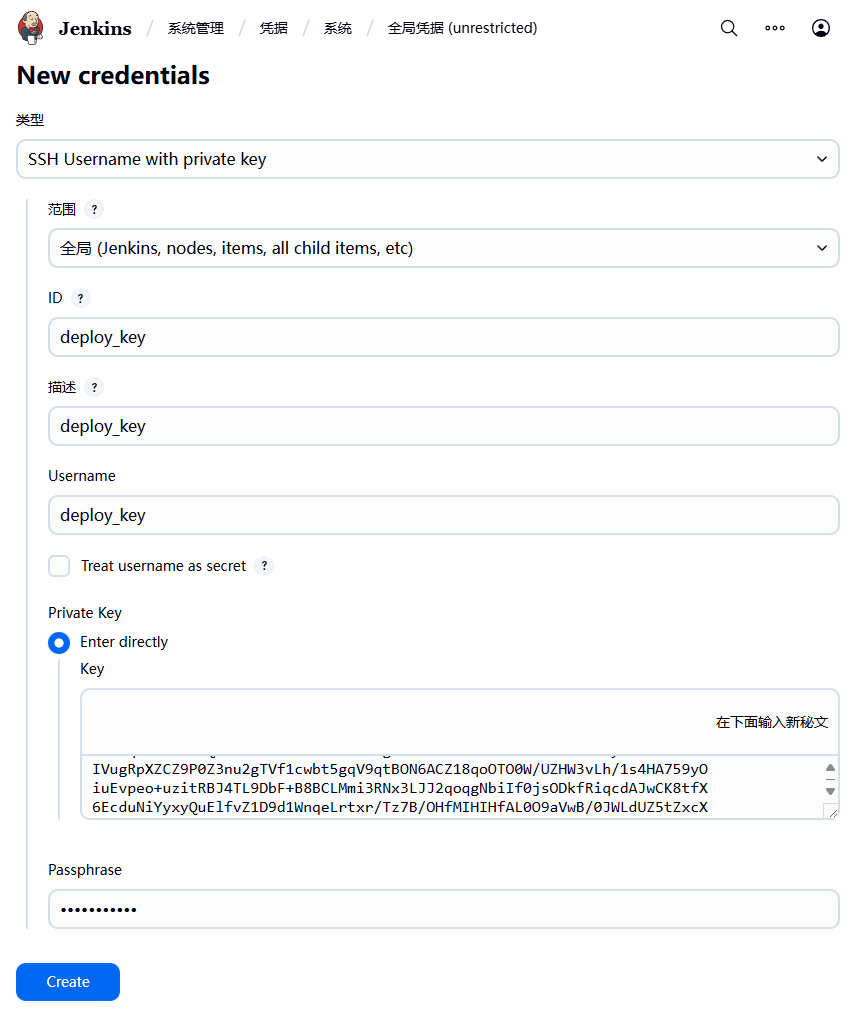 1.登录 Jenkins,进入 系统管理 → 凭据。2.选择对应的作用域(如 全局)。3.点击 Add Credentials,选择SSH Username with private key填写以下信息: