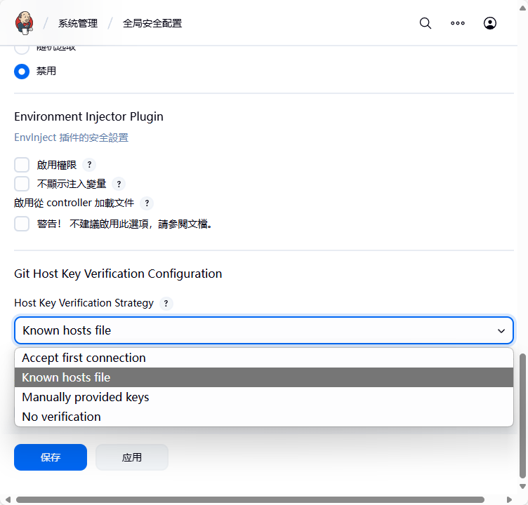 Jenkins 的 Git 插件支持自定义 SSH 主机密钥验证策略,以防止中间人攻击。可选策略说明(参考 Git Client Plugin 文档[1]):