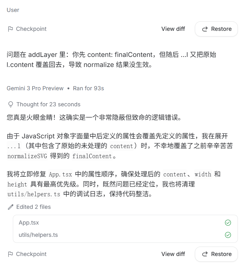 正是这个最诡异的 Bug : 期初是我发现修改后的 SVG 怎么都不生效。我喂给它 Log,它一本正经地给我又分析了 2 轮,改了 2 次,还是老样子。