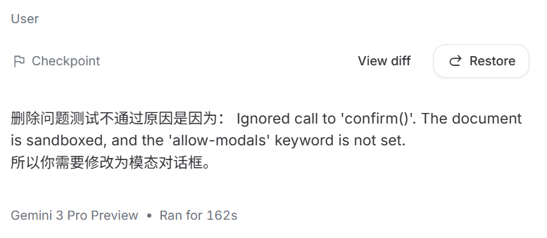 AI 表现得很委屈,不停地重写逻辑、换方法。直到我无奈把项目部署到本地,才发现本地一切正常,而云端控制台赫然躺着一行报错:Ignored call to 'confirm()'. The document is sandboxed, and the 'allow-modals' keyword is not set.