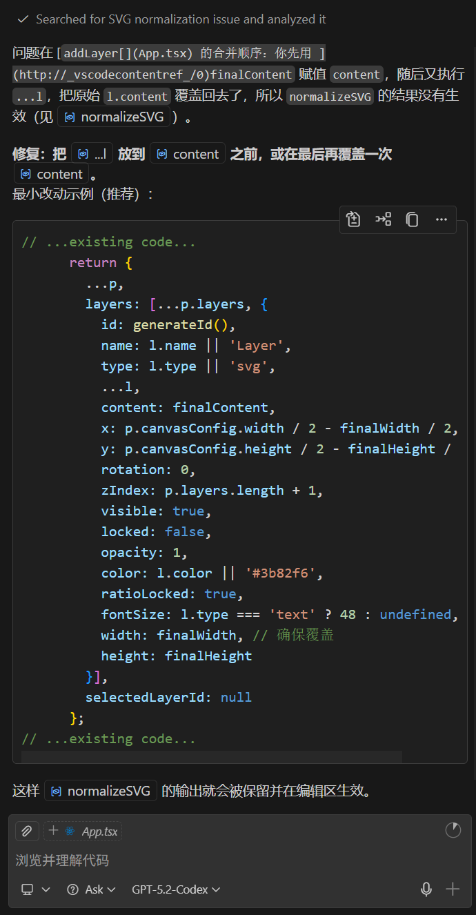 当然,也是模型还不够强大,在本地使用了最新的 GPT-5.2 Codex 很快就发现了这个问题,并且修复了它。