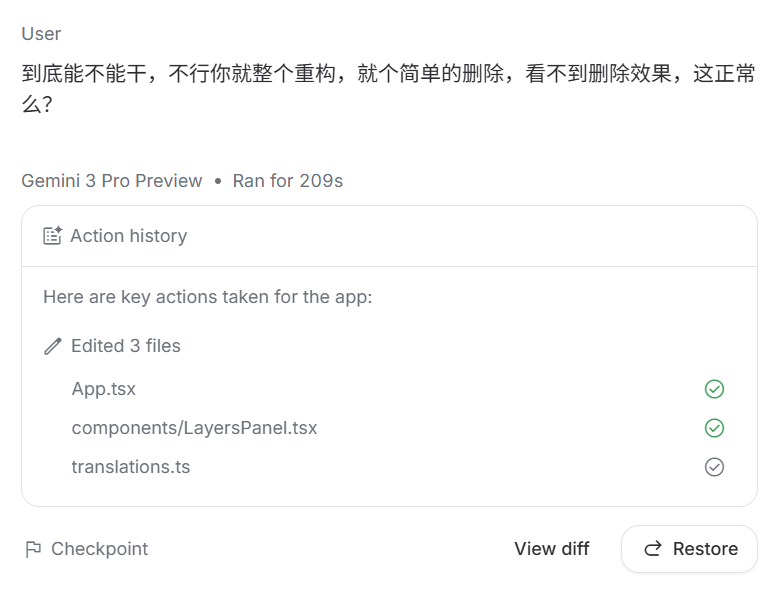 最让我崩溃的是“删除功能失效”。我甚至急得对它发火:“到底能不能干?不行就重构!”