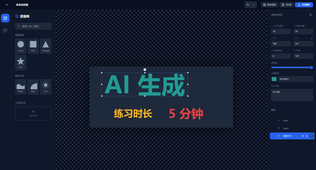上面的截图是我让它做的一个“封面图制作神器”,功能非常简单:自由编辑、缩放、组合 SVG 资源,最后导出 PNG。之前我一直是在 PPT 里面做这种图,虽然有计划,但一直没有时间去实现。现在,AI 直接帮我做了一个成品。