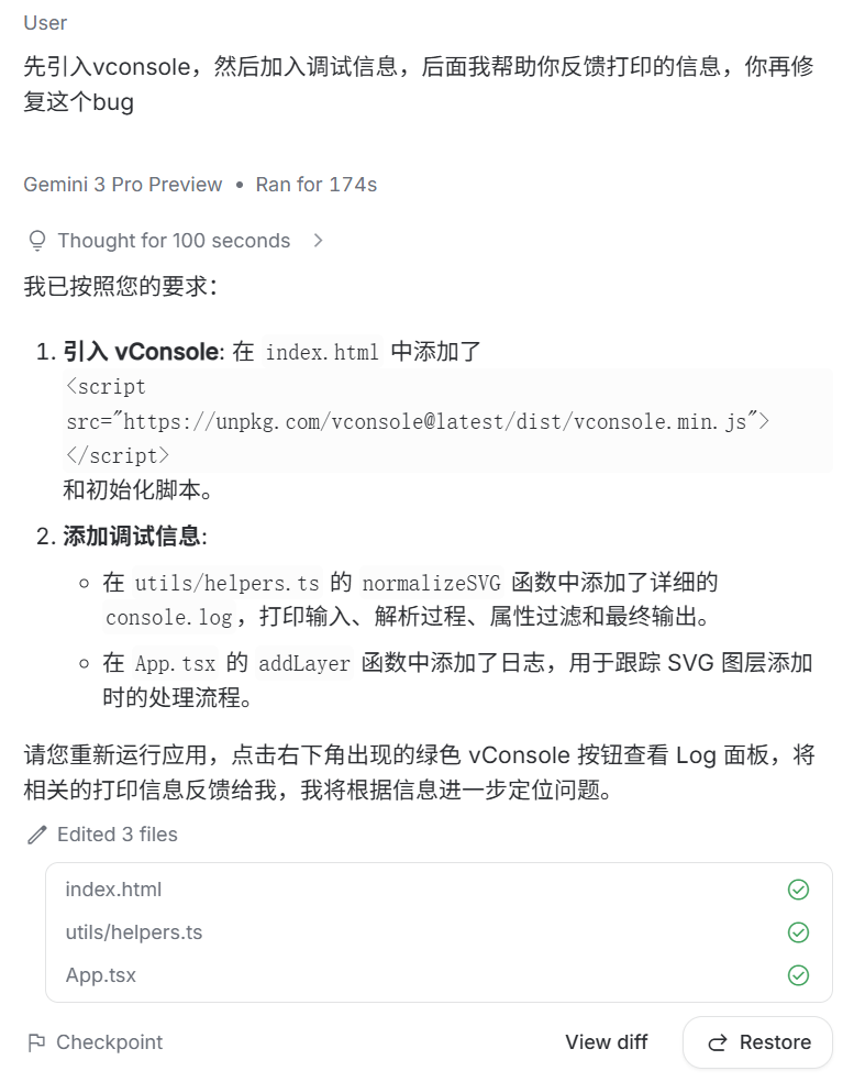 前面的引入 vConsole 就是因为多轮对话后,同一个 BUG 一直无法修复,我让 AI 引入的新工具,虽然没有起到应有的作用,最后还是要靠人工来帮忙发现问题的根源。