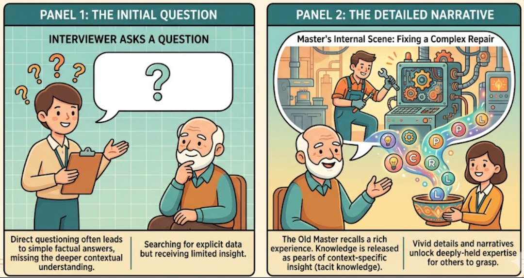不要问老师傅“你的工作流程是什么”。你要找个懂业务的人,或者直接用AI语音助手,去跟老师傅聊天:“王工,听说上个月那个极其复杂的设备故障是你搞定的?太牛了,你当时是怎么看出来是那根线出问题的?”