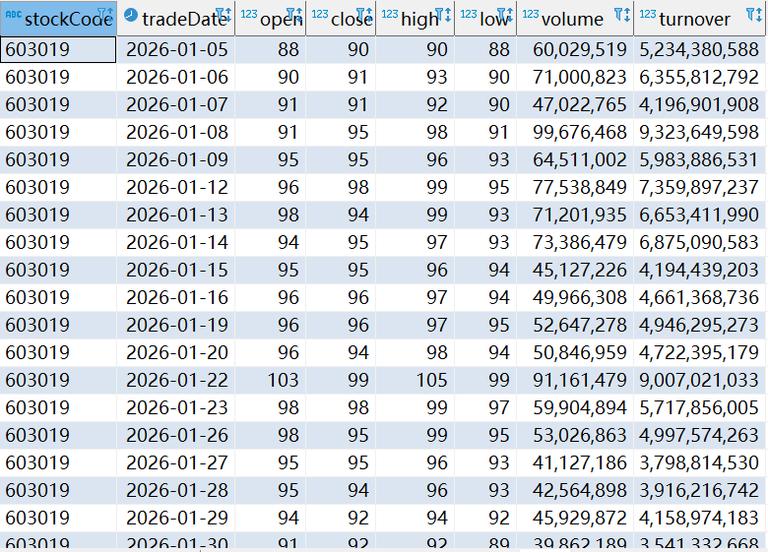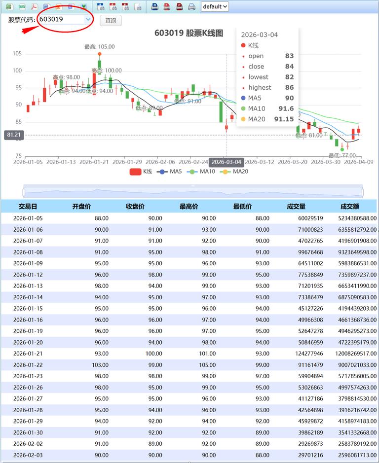 如需查询其他股票,只需在页面中输入其他股票代码(如 “603019”),报表将自动刷新并展示对应的 K 线图和明细数据。