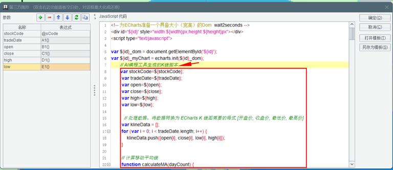 注意(重点): 参考上图 8-13 行! 从报表导出到 AI 编程工具的数据,是已经计算过的具体数值。当把 AI 编程工具生成的脚本复制回报表时,需要将具体数值改回参数引用格式,即 ${参数名}。 例如: • 改前:var tradeDate=[“2026-01-02”, “2026-01-03”,…] • 改后:var tradeDate=${tradeDate} 这样才能保证报表每次运行时都能动态获取当前查询的数据。修改完成后保存模板。