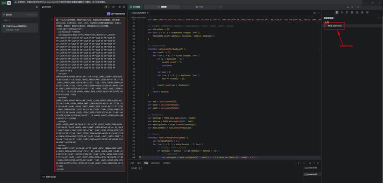 在 Trae 对话框中输入以下指令(可参考): “帮我生成一个 ECharts K 线图的 JS 代码。后面粘贴的是具体数据,包含以下参数:stockCode(股票代码)、tradeDate(交易日)、open(开盘价)、close(收盘价)、high(最高价)、low(最低价)。图表标题使用 stockCode 参数。请在图中标注最高价和最低价,并添加缩放滚动功能。” 然后,粘贴(ctrl+v)从上一步中导出的 ECharts 参数数据。