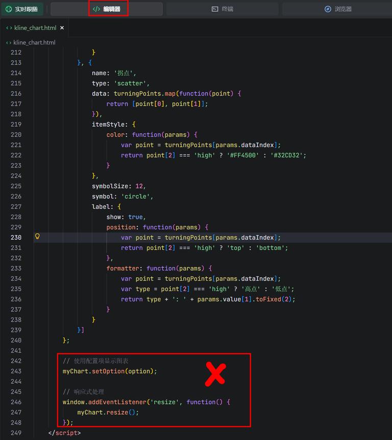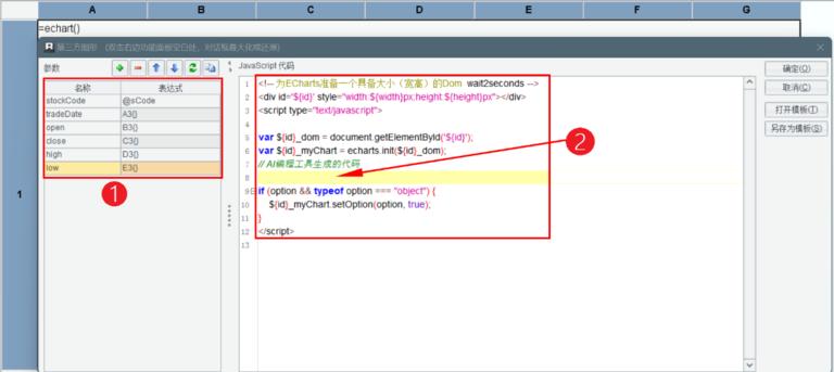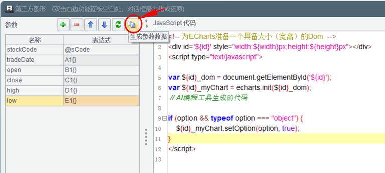 标注 2:报表生成 ECharts 图的固定基础代码(照抄即可),其中 //AI 编程工具生成的代码 所在位置(上图箭头所示),后续需要替换为 AI 生成的图形配置脚本。