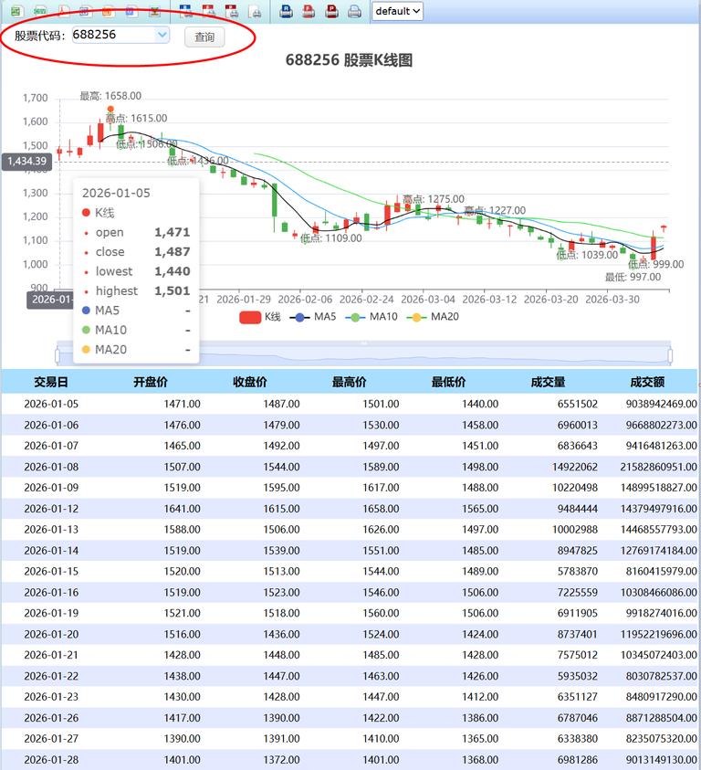 启动报表服务(以RQ内置 Demo 服务为例),在浏览器中访问以下 URL: http://localhost:6868/demo/reportJsp/showReport.jsp?rpx=testECharts1-sf.rpx&sCode=688256 即可看到股票代码为 688256 的 K 线图及明细数据: