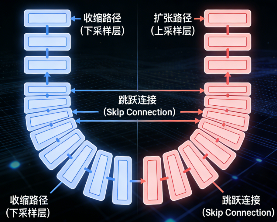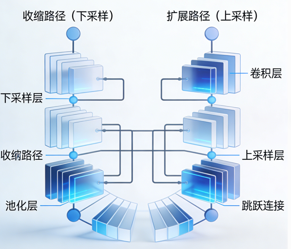 UNet 的架构分为两个对称部分: 编码器(下采样路径) 和 解码器(上采样路径) ,中间通过 跳跃连接 相连。