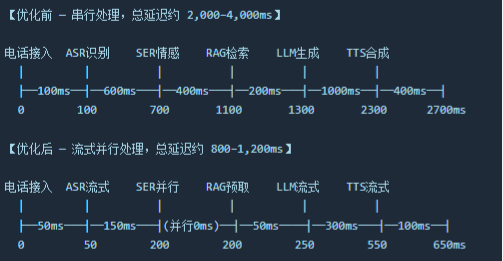 情感识别(SER) | 并行处理 | 200–500ms | 0ms(并行) | 与ASR并行,不增加延迟 |