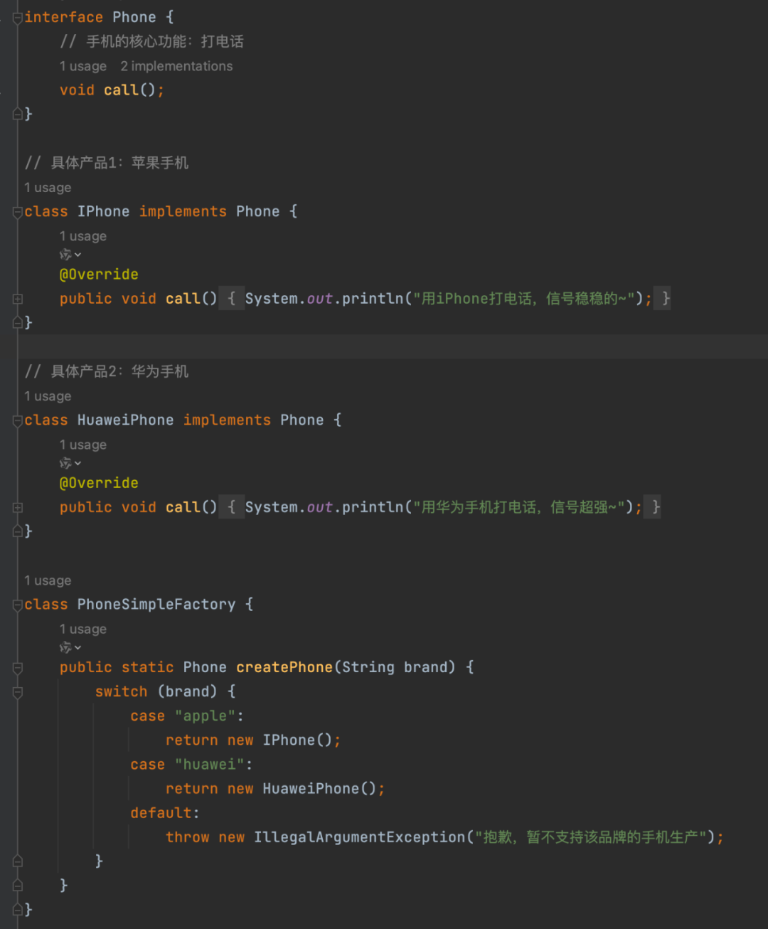 就是再建把上面的PhoneSimpleFactory#createPhone代码中的两个case通过抽象一个PhoneFactory接口,创建两个apple和huawei的PhoneFactory实现,在调用的地方new IPhoneFactory 来创建IPhone类或HuaweiPhoneFactory来创建HuaweiPhone类。这样一来,是不是要增加小米手机时,之前的IPhoneFactory、HuaweiPhoneFactory、IPhone、HuaweiPhone等这些已有的类,是不是不需要做任何改动了?那这是不是既解耦,又符合开闭原则了?是的。但你是不是觉得有种“好笨”、“好蠢”、“好耿直”的感觉!