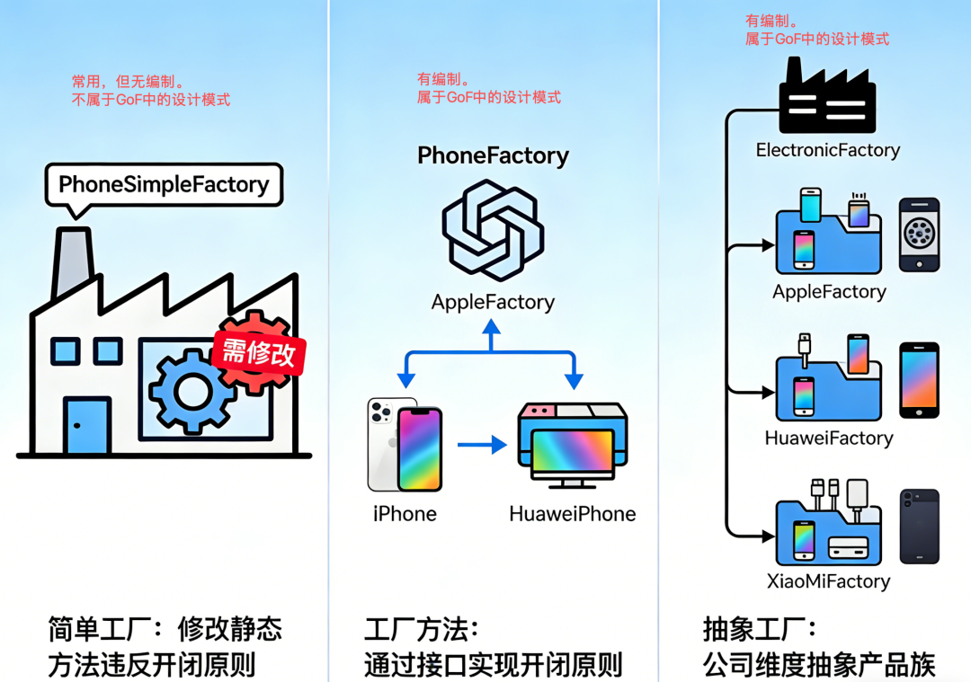 }ElectronicFactory,影响所有具体工厂类,扩展产品类型的成本较高。模式 | 核心逻辑 | 扩展方式 | 适用场景 |