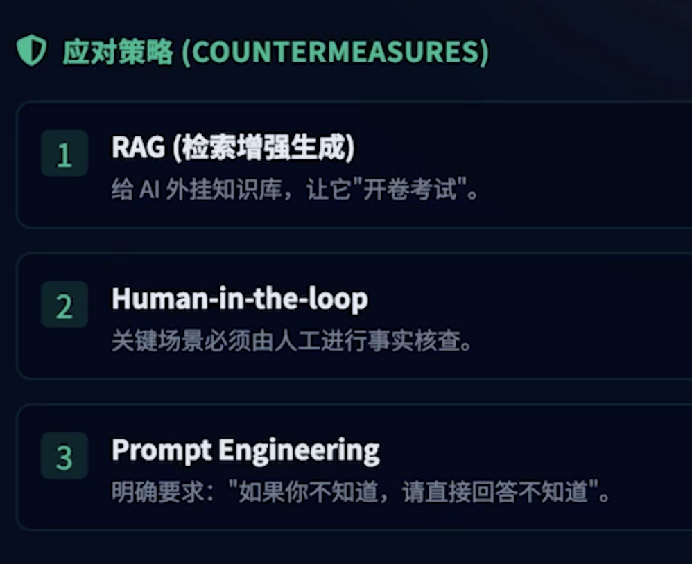 哪怕做了前面的准备,也难免有漏网的 “胡说”,这时候就得靠 人机回环(Human-in-the-loop)兜底 —— 对应图里 “关键场景人工核查” 的策略: