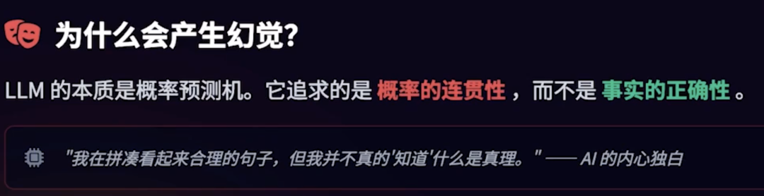 大模型的幻觉,根源在于它的 “本质属性”:LLM 是个 “概率预测机”,它只追求句子的 “概率连贯性”,不关心内容的 “事实正确性”。