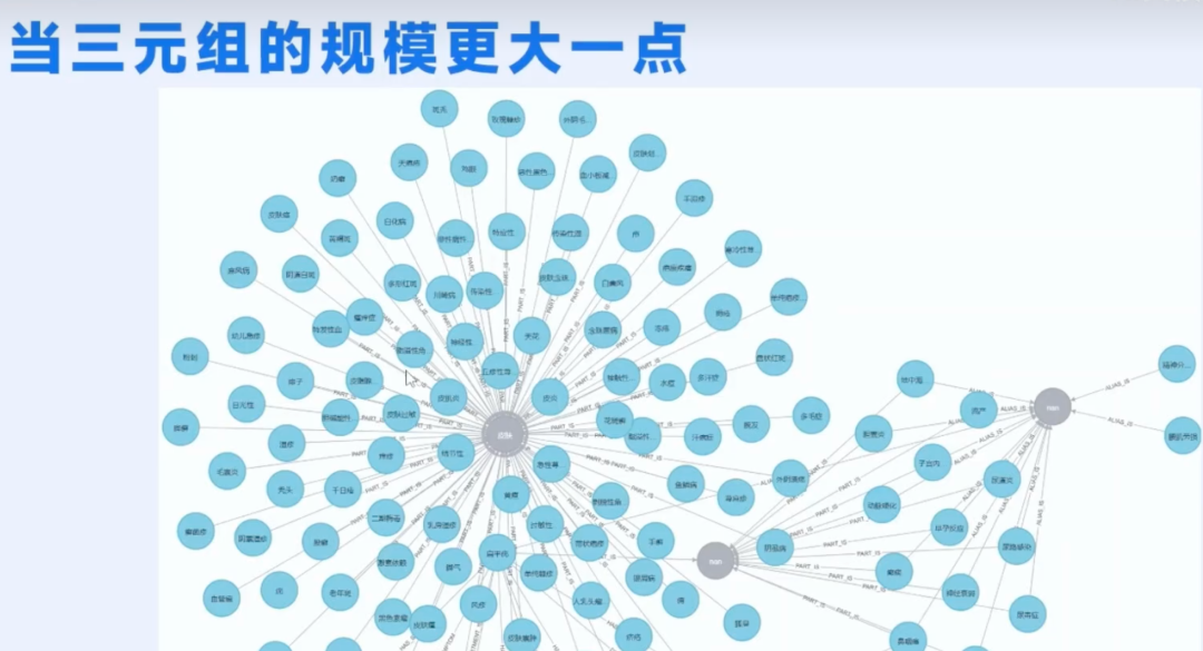 最终我们会得到覆盖特定领域的宏大知识网络——比如医学知识图谱。以“皮肤”这个节点为例,它关联的有皮炎、天花、水痘等多种疾病,每种疾病又对应着具体症状、治疗方案等信息。这张图谱把原本散落在书本里、网页上、医生脑子里的零散知识,整理得井井有条、一目了然。