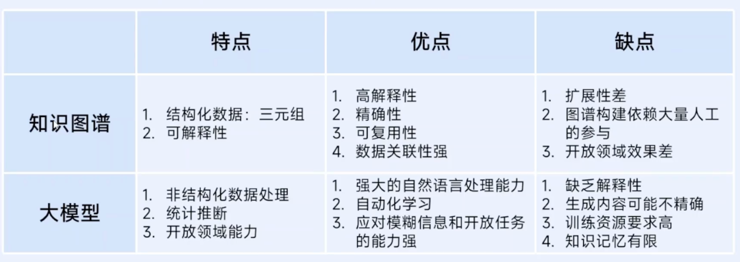 先看两者的核心差异:大模型擅长理解语言、泛化能力强,能读懂海量文本,但容易“说胡话”(产生幻觉),而且推理过程像“黑箱”,没法解释;知识图谱擅长结构化组织知识,信息准确可验证,推理过程透明,但不擅长理解自然语言、泛化能力弱。